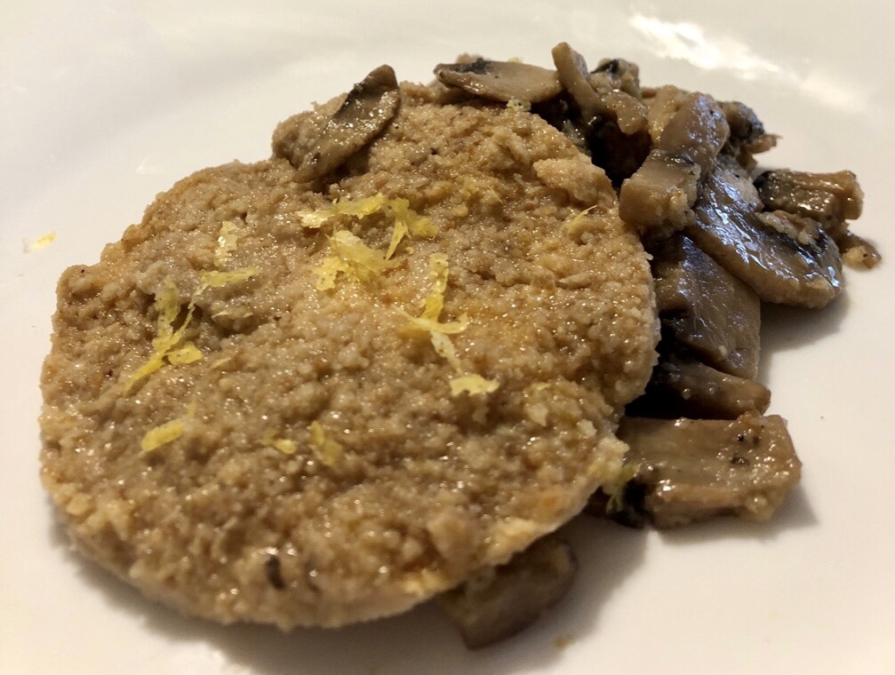 Ungere una teglia con un filo d’olio e mettere sul fondo i funghi trifolati ed il loro sughetto (togliendo l’aglio) sopra disporre le fettine di tacchino impanate ed irrorare con il brodo vegetale .