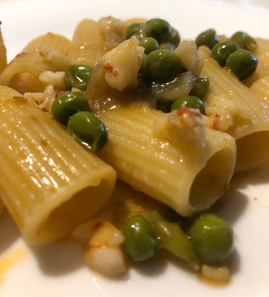 Verso fine cottura dei piselli togliere il coperchio, alzare la fiamma ed unire la bisque e fare restringere un poco, spegnere il fuoco ed unire le code di gamberoni e incoperchiare (si cuoceranno col calore dell’intingolo).