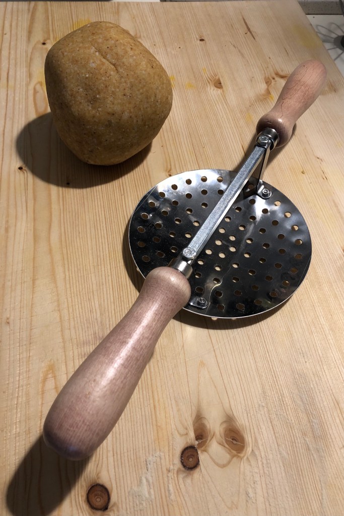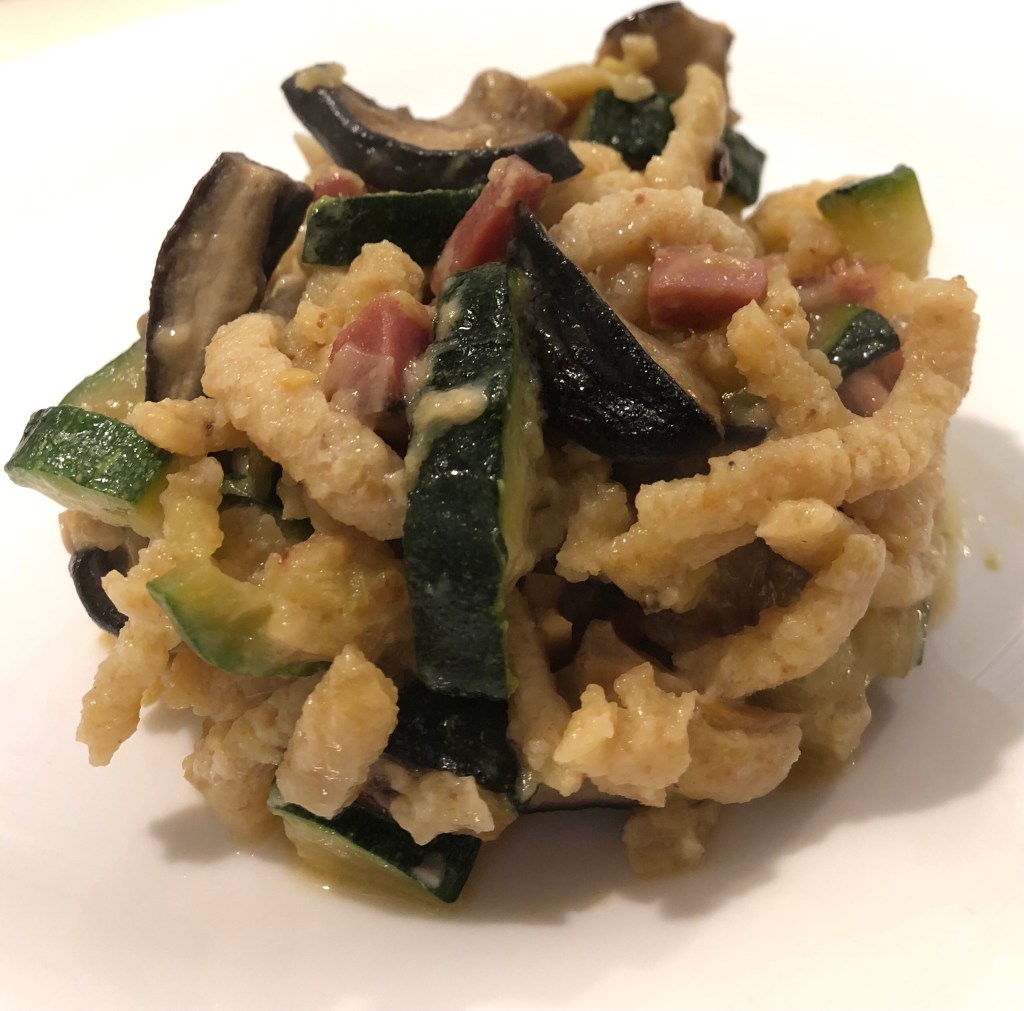 impastare tutti gli ingredienti e lasciare riposare, poi realizzarli con l’apposito attrezzo. per il sugo: tritare lo scalogno e aggiungere le zucchine; quando sono cotte aggiungere lo speck, senza cuocere molto.