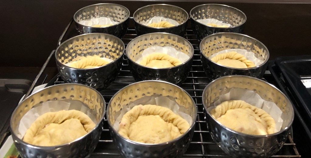 preparare la pasta frolla su di un piano mescolare la farina, l’olio, il lievito di birra sciolto in un pochino di acqua tiepida, il sale e l’acqua che necessita. Lavorare l’impasto rendendolo liscio e omogeneo. Far lievitare il panetto coperto con un canovaccio fino al raddoppio del volume. Stendere il panetto delicatamente, per non intaccare la lievitazione, tra due fogli di pellicola e ricavare dieci cerchi da cm 10 di diametro e altrettanti da 7 cm di diametro . Dentro delle coppette di metallo adagiare un disco di carta fono del diametro di 11 cm circa . Farcire con il ripieno tutta la superfice e spolverare con del parmigiano ogni empanadina e chiuderla ricamando il bordo con le dita, una volta sigillata adagiarla nella coppetta. Procedere allo stesso modo con tutte le Empanadinas ed alla fine spennellarle con del tuorlo d’uovo e sistemarle sulla griglia del forno. Infornare a 180°per circa 40 minuti e………….. Buon appetito! Ecco pronte le Empanadinas!
