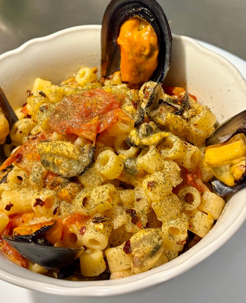 Iniziate con mettere in una pentola due litri d’acqua e un pugno scarso di sale, mettete “a crudo” 450 gr di fagioli (surgelati o messi a bagno da almeno un giorno), 3 patate sbucciate e tagliate a pezzettini sottilissimi, mezza cipolla 1 bicchiere di olio extra vergine di oliva e peperoncino a piacere Al momento dell’ebollizione, abbassate la fiamma e continuate la cottura a fuoco lento per un’ora e un quarto. Quando i fagioli saranno cotti, buttate quattro pugni di ditalini n.47 (un pugno a persona). In un altro tegame mettete 1 chilo di cozze con aglio e prezzemolo e olio extra vergine d’oliva. Quando si aprono, togliete i gusci e versatele insieme al soffritto (compresa l’acqua di mare che hanno levato) nella zuppa dove la pasta è ormai pronta. Tenetele per qualche minuto e poi servite a tavola