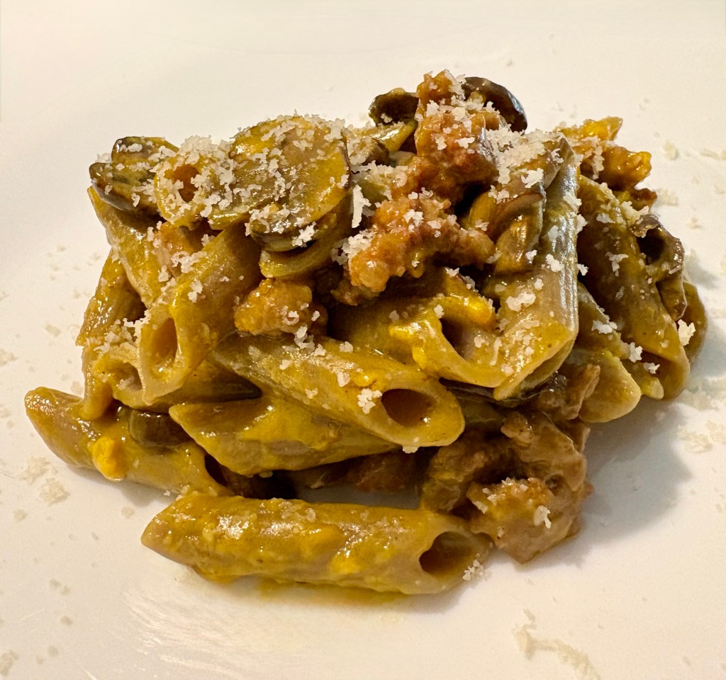 Mettiamo un filo d’olio e uno spicchio d’aglio in padella appena si colora aggiungiamo la salsiccia sgranata facciamo rosolare per qualche minuto e sfumiamola col vino bianco, in un’altra padella mettiamo l’altro spicchio d’aglio appena si colora mettiamo i funghi tagliati e ben distribuiti nella padella alziamo la fiamma e lasciamoli cuocere così per qualche minuto senza toccarli assolutamente, passato tale tempo, facciamoli saltare e portiamoli a cottura aggiustiamo di sale spegniamo la fiamma e mettiamo da parte.