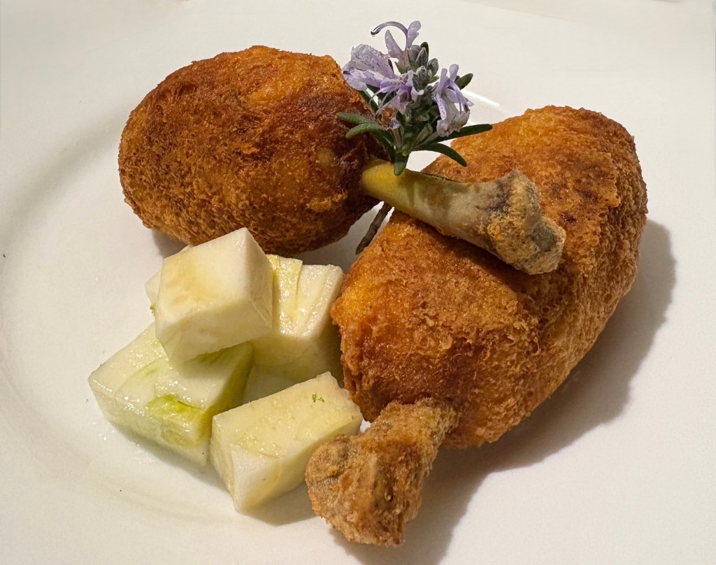 - Fai cuocere in acqua bollente le cosce di pollo,appena fredde spolpale e metti le ossa ben pulite da parte e la carne nel frullatore con 2 uova i pomodori i capperi e 150 g. di parmigiano reggiano, frulla il tutto e fai un impasto omogeneo e crea delle palle all’interno di ognuna posiziona l’osso ricreando la forma della coscia quando pronte tutte passale nell’uovo e poi nel restante parmigiano reggiano, friggile in olio extravergine di oliva a 170 gradi fino a doratura .